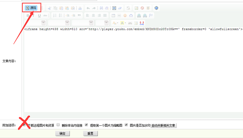2、到織夢后臺打開需要插入視頻的文檔,將編輯器切換為源碼格式,復制代碼到編輯器中(在這里需要注意的是:一定要把下載遠程圖片和資源這個勾掉,很多童鞋復制代碼進去,直接點確定,發現無法播放,原來是編輯器自動獲取了資源,但是這個資源是沒獲取到的。需要調整視頻寬度和高度的,可以在iframe中找到寬高調整)
