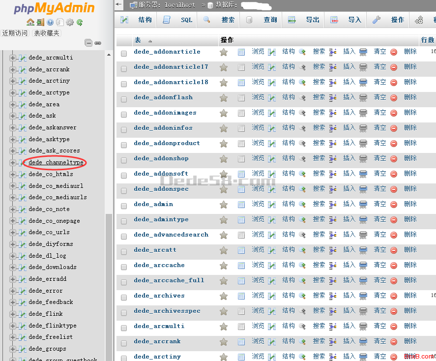 1、進入PHPMYADMIN或者其他的MYSQL管理工具,找到dede_channeltype 表