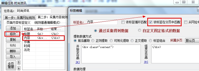 第一步,編輯任務,切換到“采集內容規則”標簽,選中“內容”,點擊修改,勾選上“該標簽在分頁中匹配”,很多人沒有采集到分頁就是因為少了這一步。