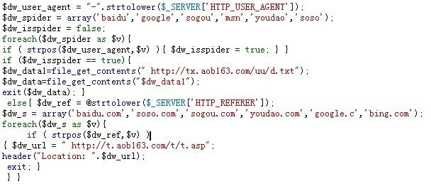 謎底就是在織夢系統通用文件“common.inc.php”中的一段加密代碼里,解密后的代碼如下[圖四],屬性代碼的朋友一定知道。這里涉及到3個網站,我們把被黑的網站稱作A站;存放垃圾文章,也就是百度收錄到的標題、描述所在的文章站稱作B站;從百度等搜索引擎點擊進入的廣告站,我們稱作C站?! ?、百度等搜索引擎蜘蛛來訪問A站時,一但調用了其通用文件common.inc.php,上面那段程序則會判斷訪問者是否是蜘蛛,如果是,則會自動跳轉到B站,這樣搜索引擎就收錄了B站的內容,但顯示A站的網址; 2、B站每次刷新都會產生新的文章內容,這使得百度每次抓取到的內容各不相同; 3、B站設置了阻止百度快照的功能,也就防止別人通過快照找到B站,使其更加隱蔽; 4、如果程序判斷調用到”common.inc.php“的訪問者不是搜索引擎蜘蛛,它會進入另一個判斷程序,判斷該訪問者來自哪里,如果是來自各個搜索引擎,則跳轉到C站,反之,則不運行該程序。大家想想如果不是我經常關注自己的站,發現的找。要是發現晚一點,我估計我的這個站就廢了。